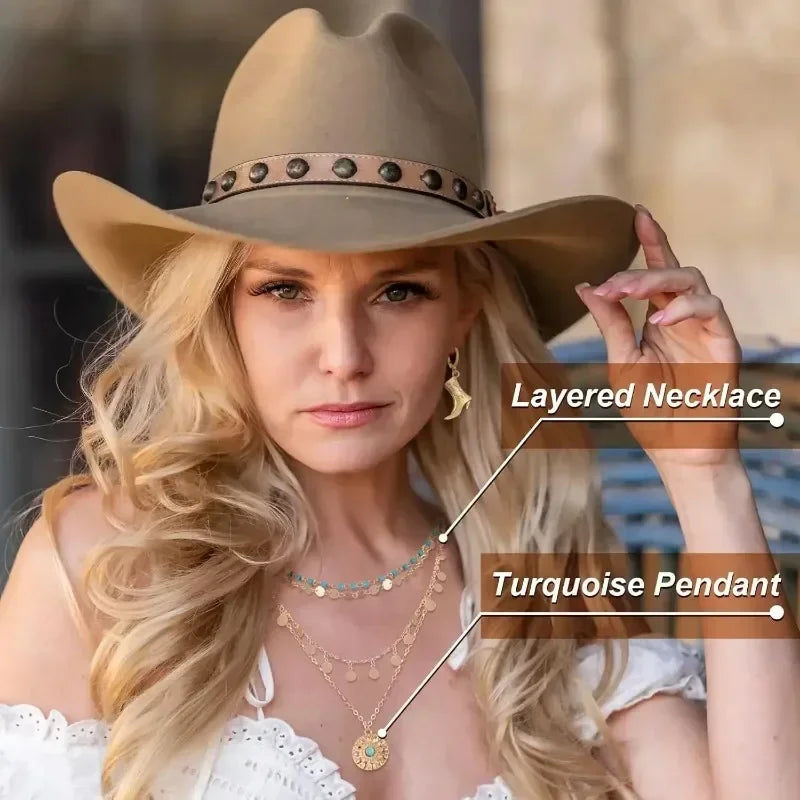 6 Pcs Cowgirl Jewelry for Women Turquoise Chain Layered Necklace Cowgirl Boot Hat Earring